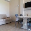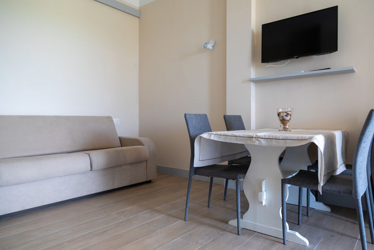 • Soggiorno pranzo con angolo cottura attrezzato, TV, tavolo con sedie, frigo a incasso, stoviglie e condizionatore.