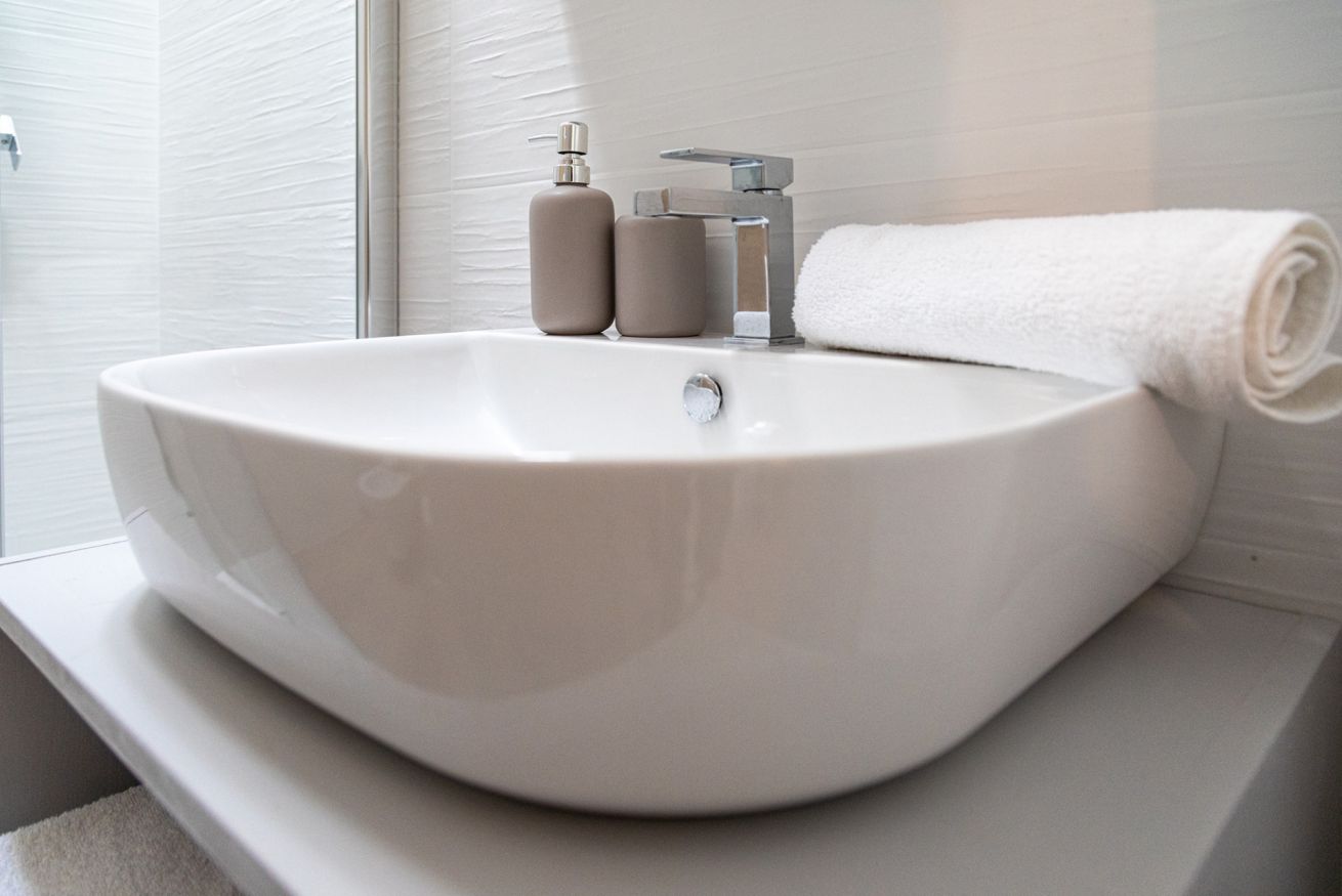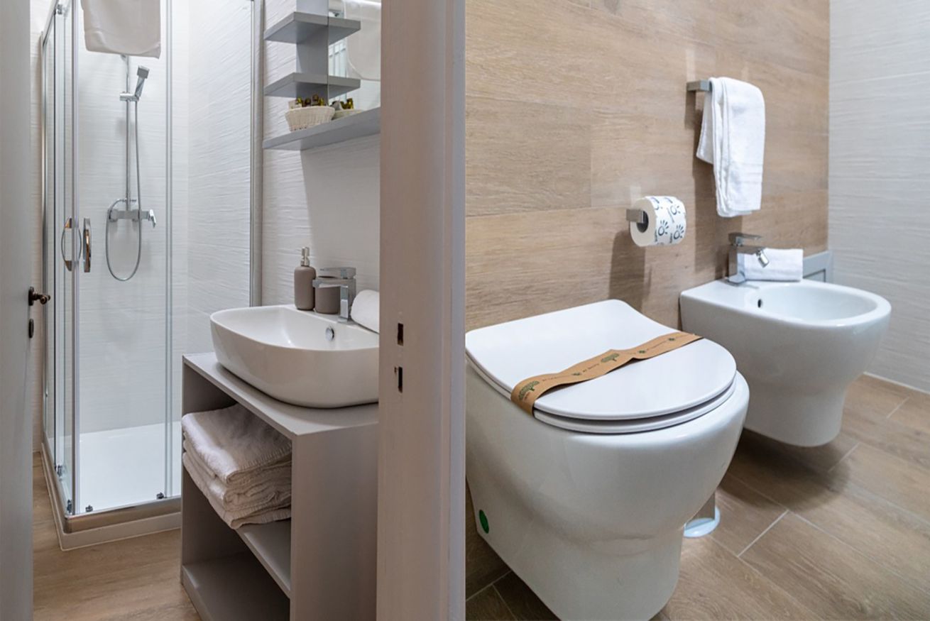 • 1 Bagno con impianto di aspirazione, composto da: lavabo, wc, bidet e box doccia;