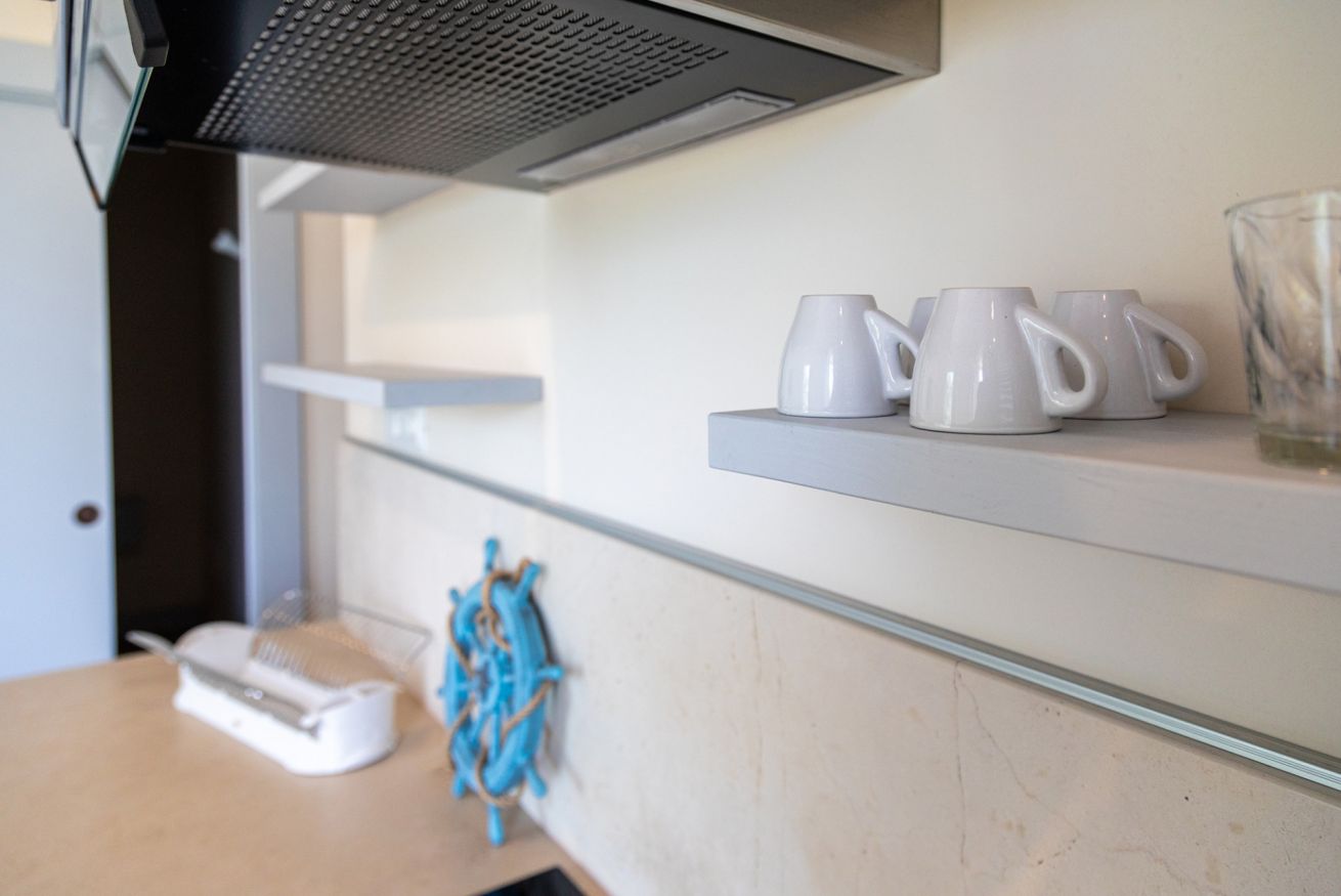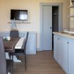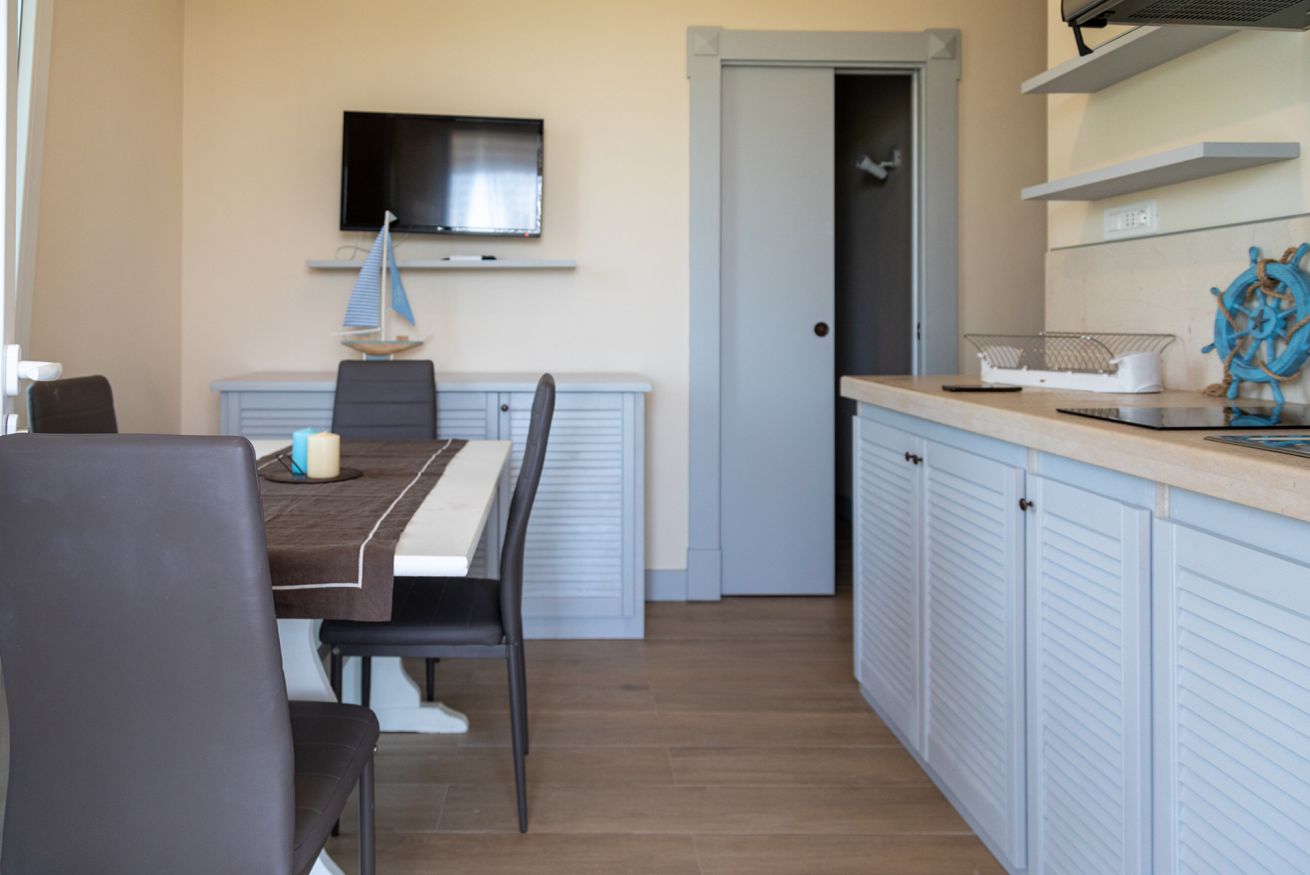 • Soggiorno pranzo con angolo cottura attrezzato, TV, tavolo con sedie, frigo, stoviglie e condizionatore;