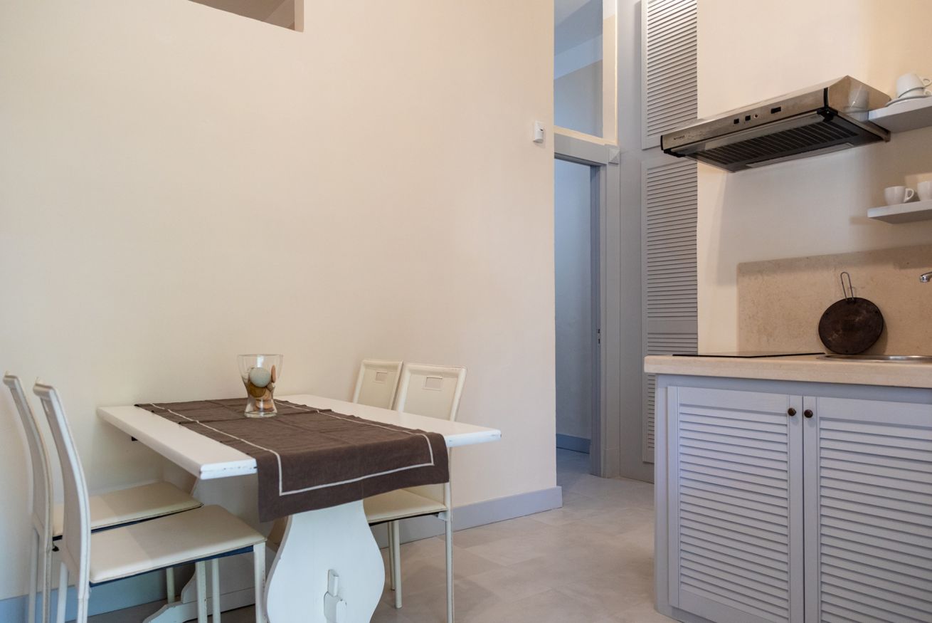 • Soggiorno pranzo con angolo cottura attrezzato, TV, tavolo con sedie, frigo, stoviglie e condizionatore;