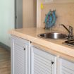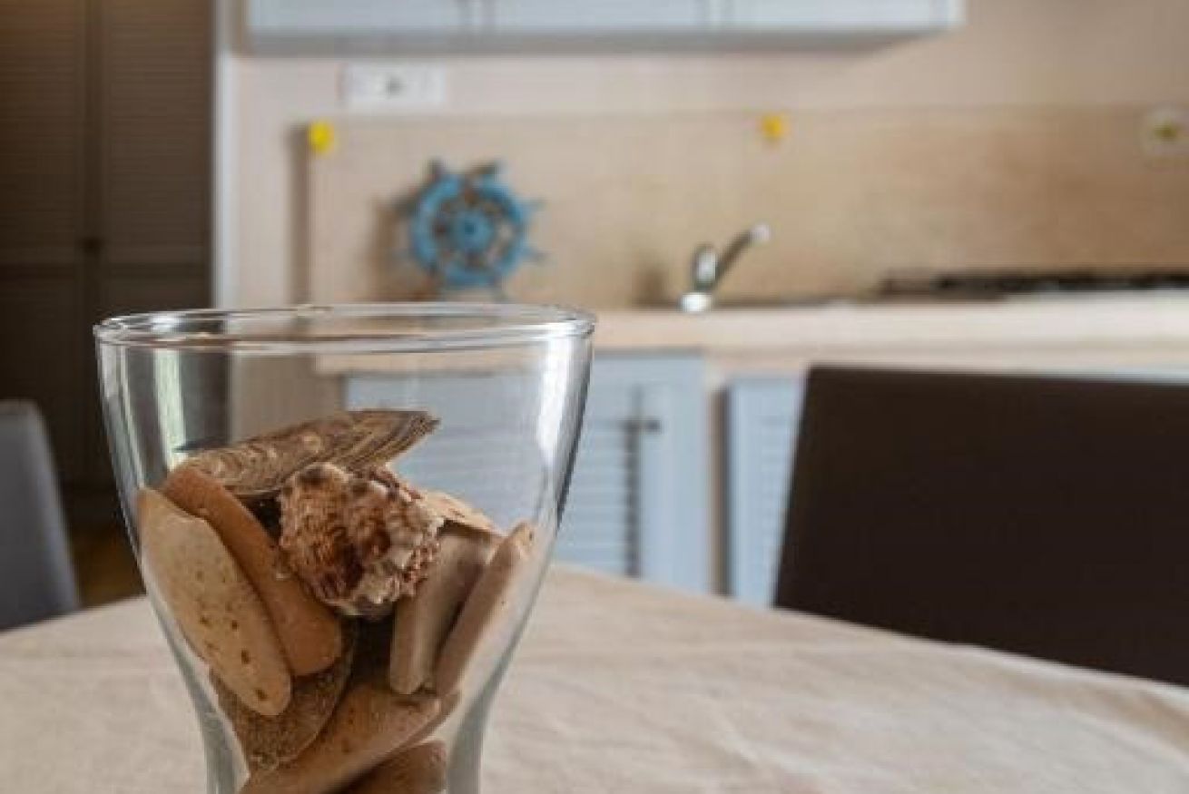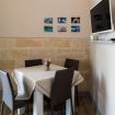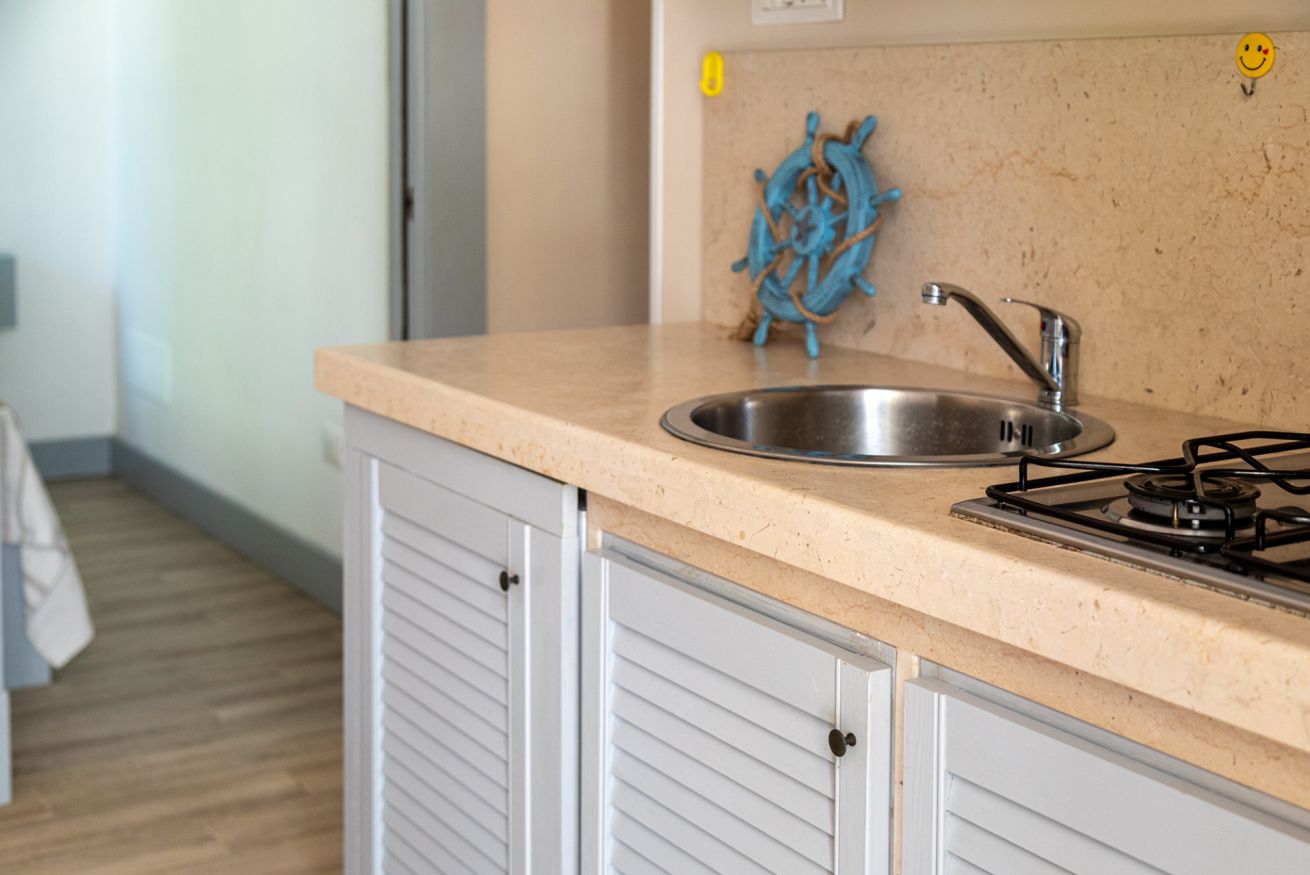 • Soggiorno pranzo con angolo cottura attrezzato, TV, tavolo con sedie, frigo a incasso, stoviglie e condizionatore.