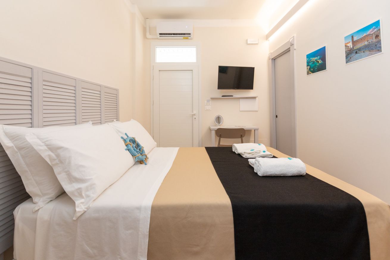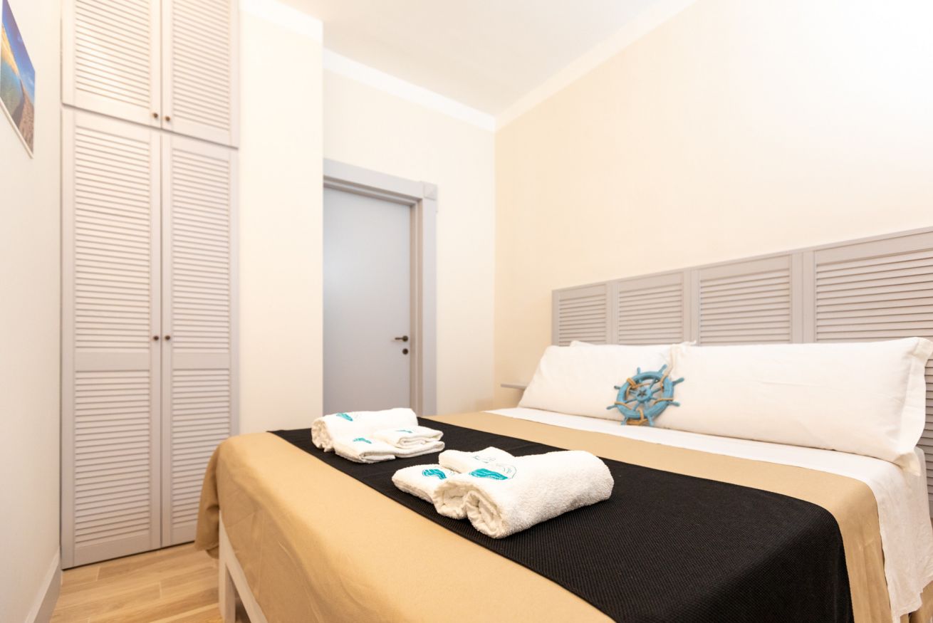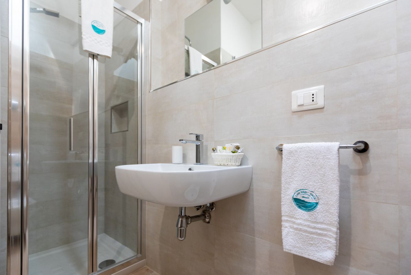 Camera matrimoniale con bagno annesso completo di servizi (wc, bidet, lavabo e box doccia), frigo e dehor attrezzato.