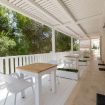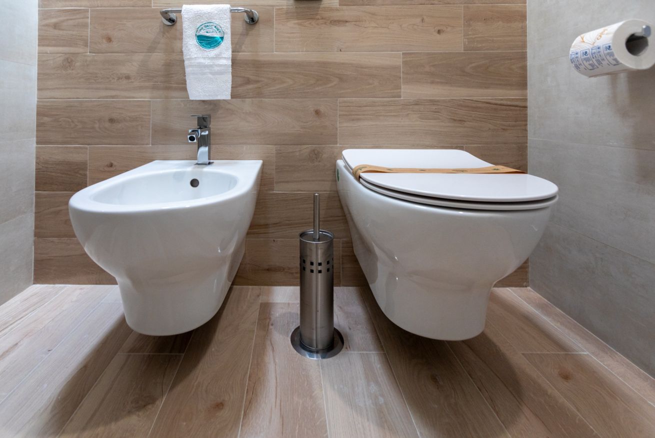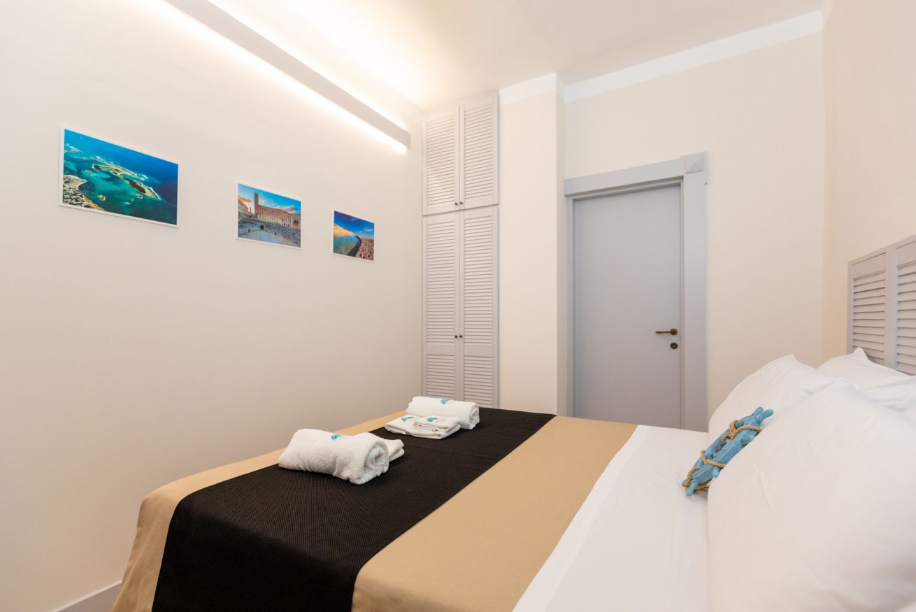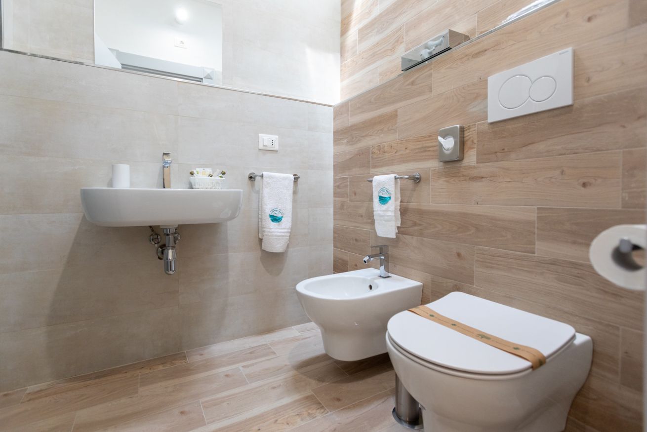 Camera matrimoniale con bagno annesso completo di servizi (wc, bidet, lavabo e box doccia), frigo e dehor attrezzato.