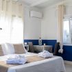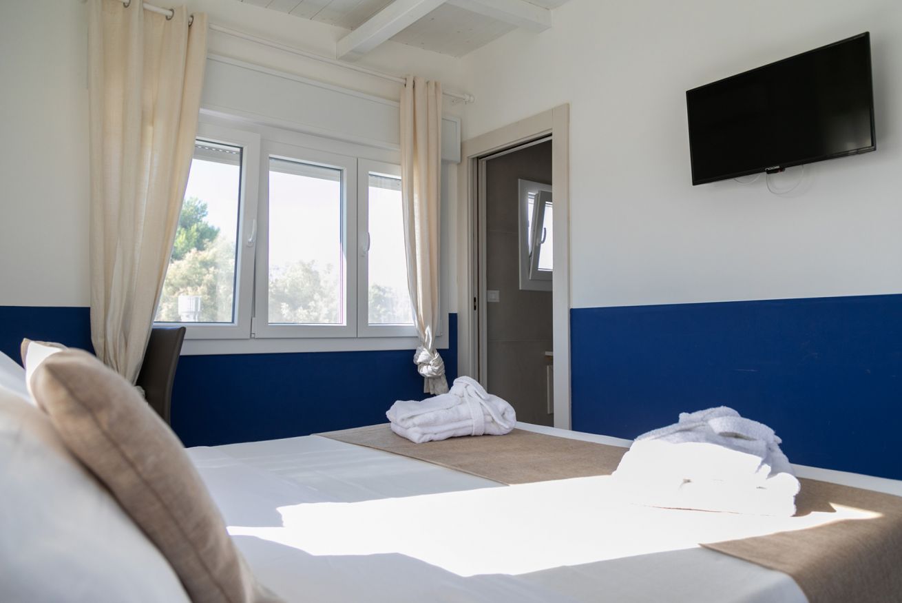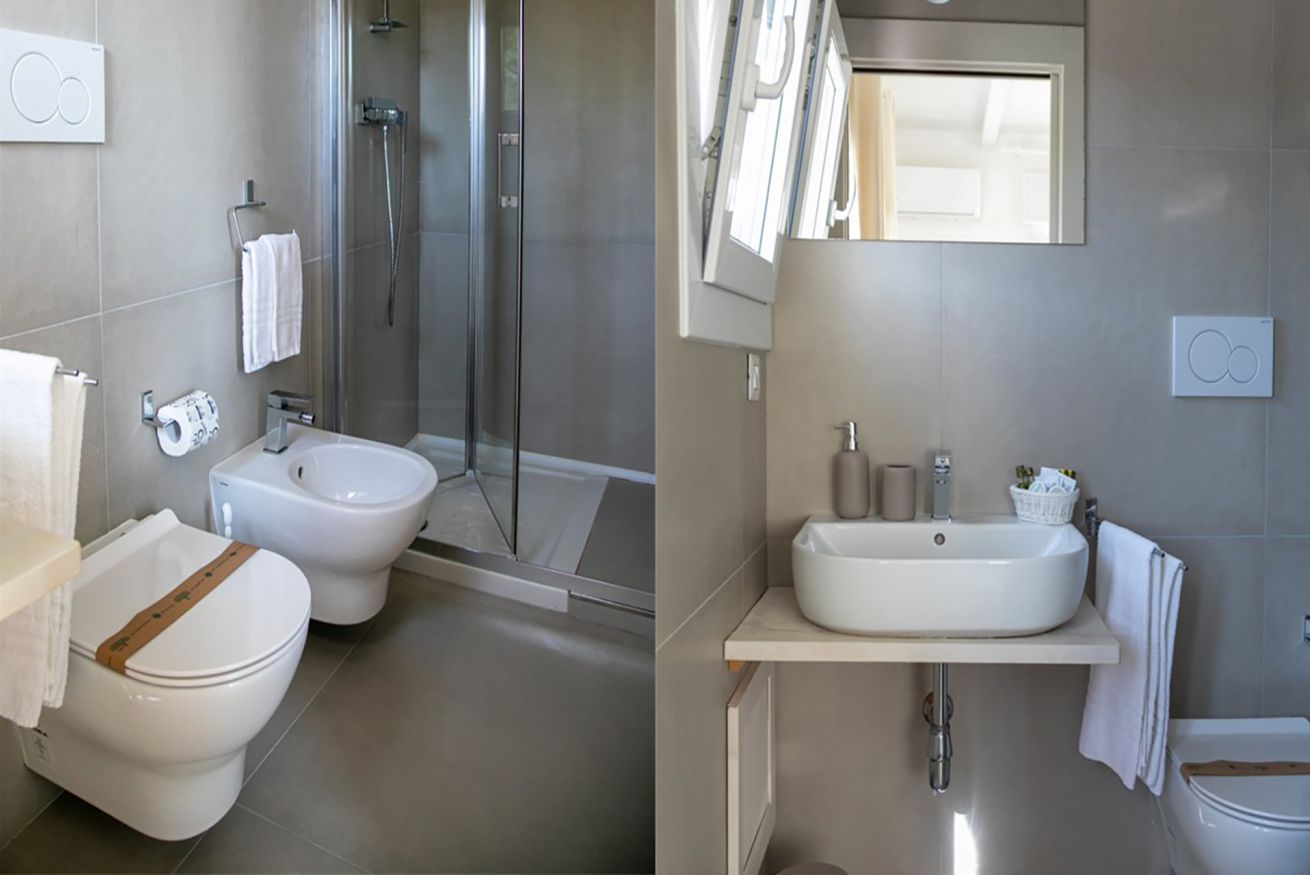 Camera matrimoniale con bagno annesso completo di servizi (wc, bidet, lavabo e box doccia) e frigo.